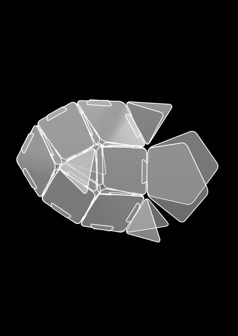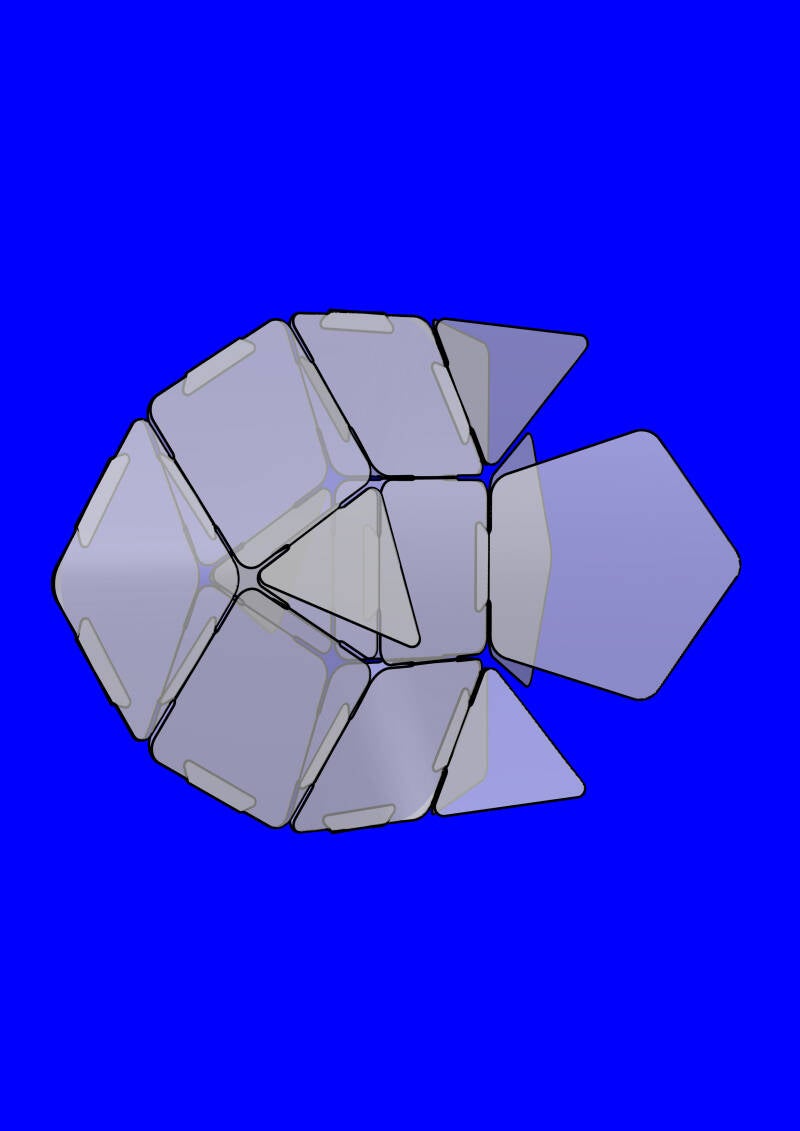 Guusje Gup bouw je door 2 vijfhoeken, 6 vierkanten, 6 smalle ruiten en 8 driehoeken met 27 elastiekjes op de juiste manier aan elkaar te verbinden.