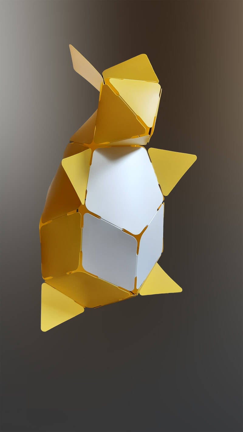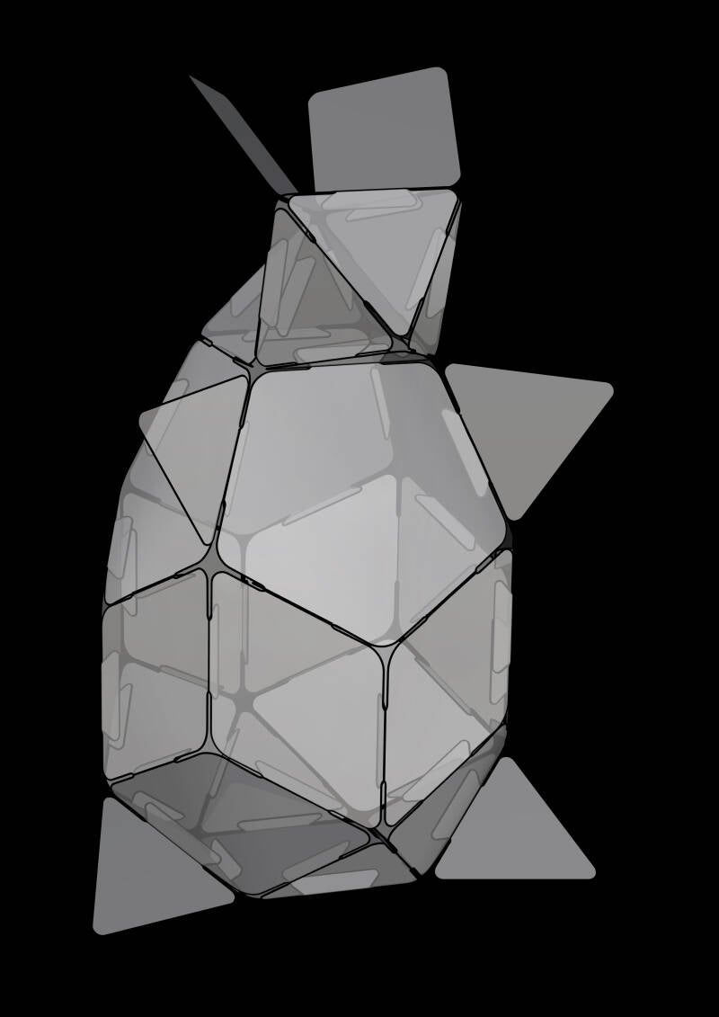 Hella Haas bouw je door 14 smalle ruiten, 4 vijfhoeken, 19 driehoeken en 1 vierkant met 57 elastiekjes op de juiste manier aan elkaar te verbinden.