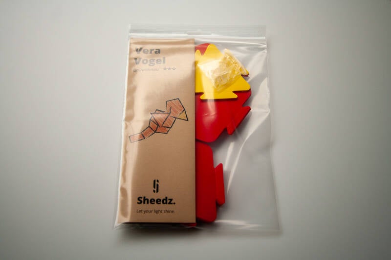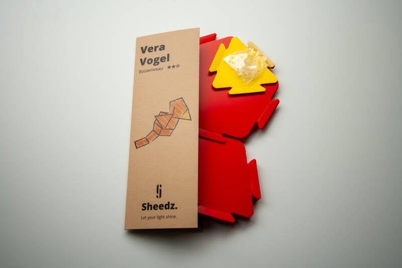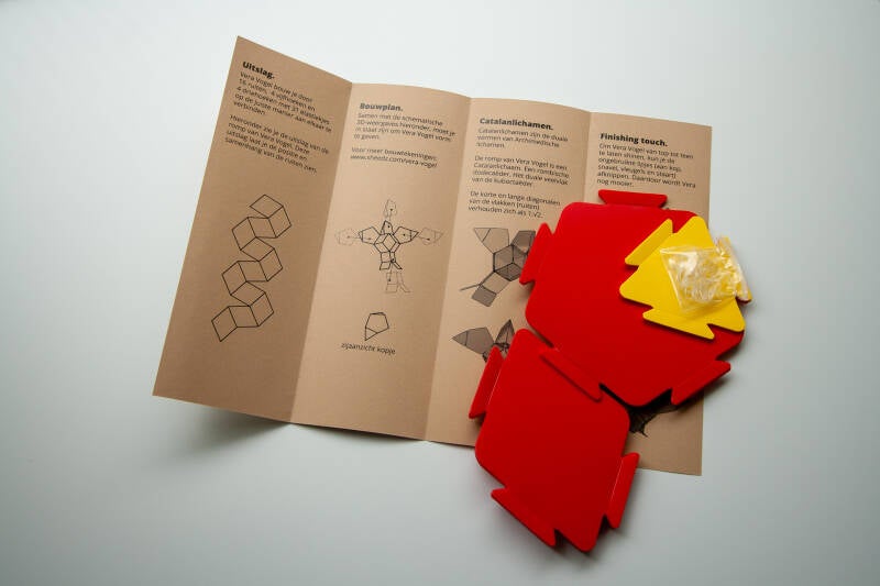 Vera Vogel bouw je door 16 brede ruiten, 4 vijfhoeken en 4 driehoeken met 31 elastiekjes op de juiste manier aan elkaar te verbinden.